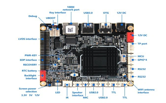 4. Rich expansion interfaces. 4 USB ports (1 USB2.0 OTG, 1 USB3.0 Host + 2 USB2.0), 4 expandable serial ports (2 TTL, 2 RS232), GPIO and ADC interfaces , can meet the requirements of various peripherals on the market.